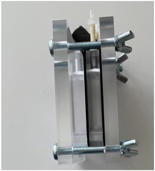 Two solid plexiglass plastic plates supported or held the defragment parts together. These two solid plates are called end plates, and they have four holes at four corners to fit M5 bolts. The anode and cathode chambers were placed in between these two end plates. M5 butterfly nuts were used to join all the components and sandwiched between the two end plates as shown in Figure 5. Rubber gaskets were used between each component to make the system leakproof. Copper wire was used to connect the two carbon felt electrodes placed in the anode and cathode chambers.