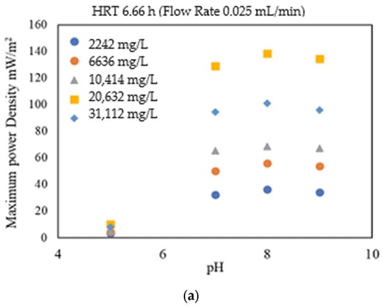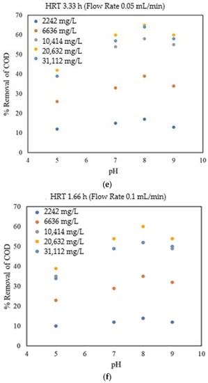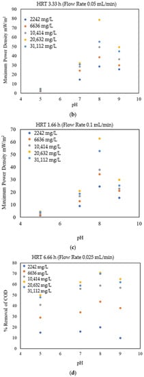 The HRT of the system varied from 1.66 to 6.66 h by changing the feed flow rate of wastewater from 0.1 to 0.025 mL/min. The output performance of the MFC is dependent on the feed flow rate. At a higher feed flow rate, which corresponds to a lower HRT, the performance of the MFC decreases. We also performed a batch study of Shewanella baltica, and the observed value of µmax was 0.83 h−1. This value indicates that, in order for the current system design to avoid washout conditions, the MFC cannot be operated above a flow rate of 0.14 mL/min [54]. The maximum power density was obtained at a flow rate of 0.025 mL/min, corresponding to an HRT of 6.66 h. Considering the volume of the MFC, a further decrease in the feed flow rate can tend the system towards batch mode operation. An increase in feed flow rate value from 0.025 mL/min leads to a decline in the power generation and percentage removal of COD and follows the same curve pattern for all ranges of initial COD and pH, as shown in Figure 6a–f.