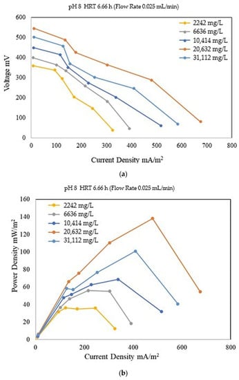 The polarization curve of the MFC at the optimized pH, HRT, and initial COD values, which were 8, 6.66 h, and 20,632 mg/L, is shown in Figure 7a. It represents the voltage monitored by the data logger when the MFC was fed with DWW at different closed circuit resistance ranges (from 40 to 0.1 Kohm). The current density was calculated using Equation (3) for every voltage. Figure 7b shows the maximum power density obtained at optimum conditions as a function of current density; this was calculated by using Equation (4). The maximum percentage of COD removal in the dairy wastewater at 6.66 h HRT and with an initial COD of 20,632 mg/L is plotted against different pH values in Figure 8, and it was calculated using Equation (5).