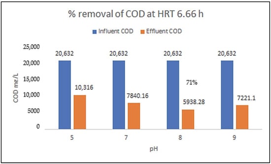 The percentage removal of COD with HRT 6.66 h and initial COD of 20,632 mg/L at different pH.