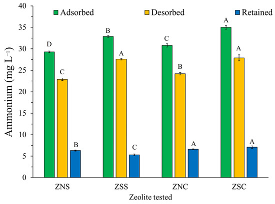 Amount of NH4+ desorbed by the tested zeolites during 24 h from a 1 M NaCl solution. Different letters indicate significant differences among zeolites for the same parameter (adsorbed, desorbed, and retained). Values are mean ± standard deviation of three replicates.