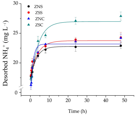 It is noteworthy that the zeolites in the present study that desorbed the highest amount of NH4+ (27.6 ± 0.2 mg L−1and 27.9 ± 0.7 mg L−1, respectively) were those treated with NaCl, i.e., ZSS and ZSC, with no significant difference between them. The higher desorption of these zeolites can be conceivably associated with the larger amount of NH4+ that is already adsorbed on each of them. As described in the discussion below, the mechanism of the desorption process is primarily linked to the ion exchange between the dissolved Na+ and adsorbed NH4+. Therefore, it is possible to suggest that the NH4+ desorption capacity of zeolites is primarily affected by NaCl treatment rather than mineralogical composition.