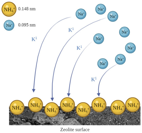 Based on the above considerations, to describe the desorption process, we referred to the parameters obtained by applying the monomodal pseudo-first-order kinetic model. Hence, a single NH4+ desorption mechanism, which involves the ion exchange between Na+ in solution and NH4+ adsorbed onto zeolites, could account for the process (Figure 3).