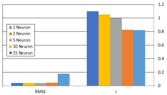 According to verification indicators—namely, the correlation coefficient and the RMSE—in different networks, it was concluded that an increase in the number of neurons increases the correlation coefficient while decreasing the RMSE. Based on data in Figure 2, it was determined from 10 neurons onwards, there is no noticeable difference between the verification indicators of related networks. On the other hand, an increase in the number of neurons, even though it increases the accuracy of the problem (which is negligible at about 0.0001), increases the elements of weights and bias matrices obtained in each model that can, to some extent, create problems for the user.