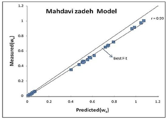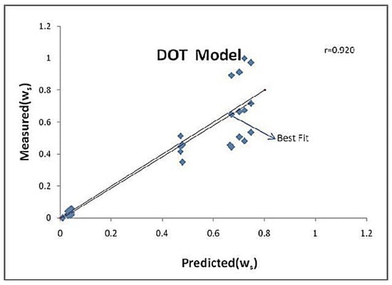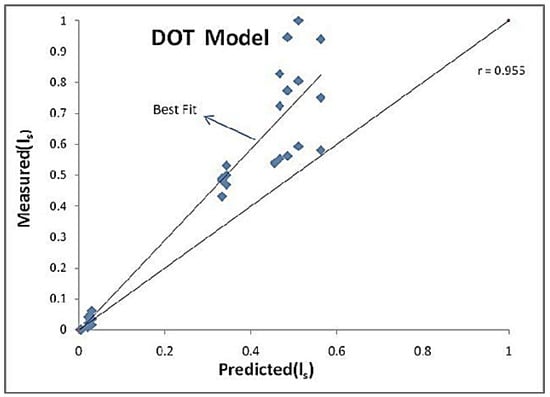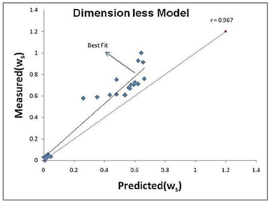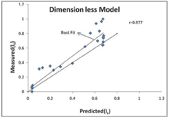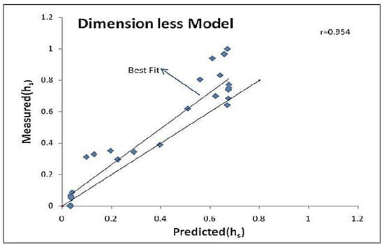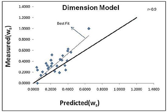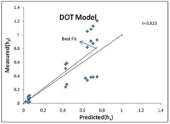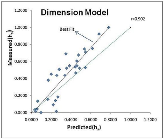 After the preparation of normalized inputs via the optimal network, verification indicators were obtained based on the data in Table 22. Moreover, Figure 10 illustrates the performance of the DOT model in estimating the width of the scour hole in the network with one neuron in the hidden layer. Regarding the performance of the DOT model, a high correlation was found between measured and predicted data (r coefficient equals 96%). Thus, the DOT model could determine the length of the scour hole.