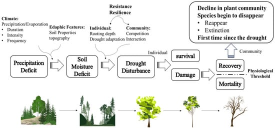 The physiological mechanisms governing vegetation adaptation and mortality in response to drought conditions exhibit considerable instability and unpredictability. These mechanisms are typically influenced by factors such as the timing and severity (duration and intensity) of the drought, the regional-specific climatic conditions, and the original species composition of the plant community. When a plant community is faced with a severe drought disturbance, the individuals within the community employ strategies to enhance their resistance to drought conditions. Following the disturbance event, certain plant species exhibiting a greater drought resistance can persist, while others experience detrimental effects. Certain plants have resilience to recover, while others succumb to unfavorable conditions and perish. The impacts of drought on various species are contingent upon the severity and duration of the event. In response to drought, certain species may have an increase in their coverage. In some cases, certain species may completely disappear, whereas others may reemerge following the ecosystem recovery after the drought disturbance. In addition to this, there will be a number of species that appear for the first time (refer to Figure 1). Therefore, the frequency of extreme drought events can have significant impacts on entire ecosystems. The many complex and interacting feedback mechanisms that do not consistently reflect the climate make it difficult, and currently impossible, to model biodiversity feedback to an arid climate. Moreover, differences in the methods used to estimate aridity indices and biodiversity may also lead to bias in the conclusions of the study. Therefore, we can adopt different estimation methods to verify each other when studying the corresponding study of biodiversity to drought. In order to obtain precise estimations regarding the impact of drought events on forest biodiversity, it is imperative to employ reliable forest datasets and models to simulate the dynamics of diversity. More notably, the diversity of forests under different systems varies considerably (e.g., natural systems and management systems); although, the diversity of boreal forests and tropical rainforests can vary considerably under the same natural system, so their response to drought may be different.