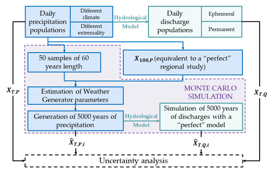 In this context, and following in the footsteps of the previous work of Beneyto et al. [17], the main objective of this paper is to quantify the uncertainty of flood discharge quantile estimates obtained by SCS in a wide range of hydro-climatic scenarios through the combination of (1) different precipitation regimes, (2) different climate extremality, and (3) different hydrological characteristics of the basin. In other words, we are trying to analyze the influence of hydro-climatic conditions on the uncertainty of the flood quantiles obtained with the SCS approach presented in Beneyto et al. [17]. Additionally, a simple sensitivity analysis for the basin size was conducted, as well as an assessment of the uncertainty transmission from the precipitation to the discharge quantiles. We propose a framework that accounts for all these different scenarios, which are represented by synthetic populations considered to be “truth” and used as benchmarks to evaluate the sample uncertainty through Monte Carlo simulations.