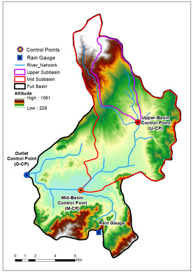Three synthetic flow gauges (hereafter Control Points (CP)) were defined within the basin as follows: the Upper basin Control Point (U-CP), collecting the waters of an approximately 24 km2 headwater tributary just before its confluence with the main stream; the Mid-basin Control Point (M-CP), with a basin area of 101.5 km2; and the Outlet Control Point (O-CP), at the outlet of the full synthetic basin (Figure 2).