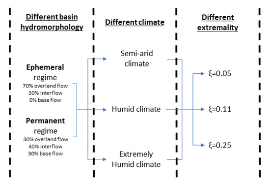 In our case, and starting from an implemented model in previous studies, two different synthetic basins with different hydrological behaviors were built up: ephemeral and permanent. These basins were created by setting the values of CF3, CF5, CF6, CF7, and CF8 based on the authors’ expertise. It is worth highlighting that, for our study, we consider our model to be “perfect”, i.e., no uncertainty is introduced in the quantile estimations by the model.
