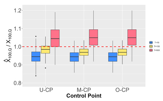 This analysis was first undertaken to find out whether the size of the drainage area influences the flood quantile uncertainty or not. The analysis was carried out considering a semi-arid climate, medium extremality (ξ = 0.11), and an ephemeral behavior of the basin. Results in the three CPs (24 km2, 101.5 km2, and 180 km2, respectively) are shown in Figure 4, where each boxplot represents the relationship between the population quantile and the simulated quantiles for the 50 realizations. A similar negative value of the RB was obtained for and for all three CPs, being again similar but positive in the case of . This latter quantile presented the higher errors, with RRMSE and CV values of up to 8.19% and 6.10%, respectively.