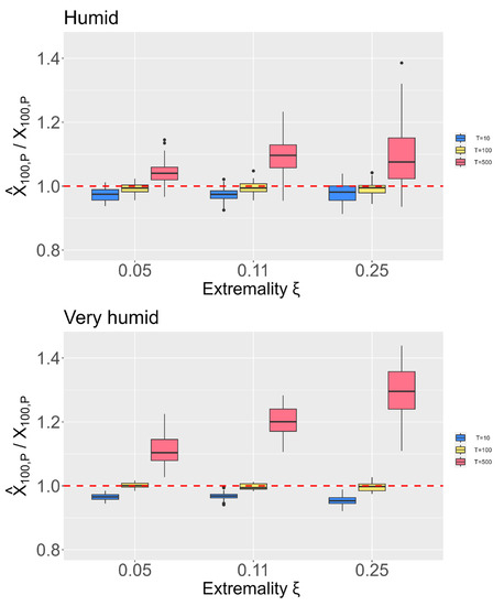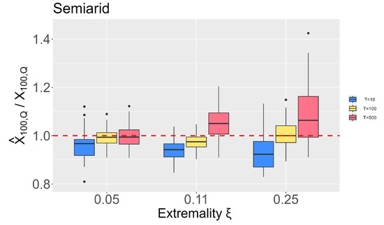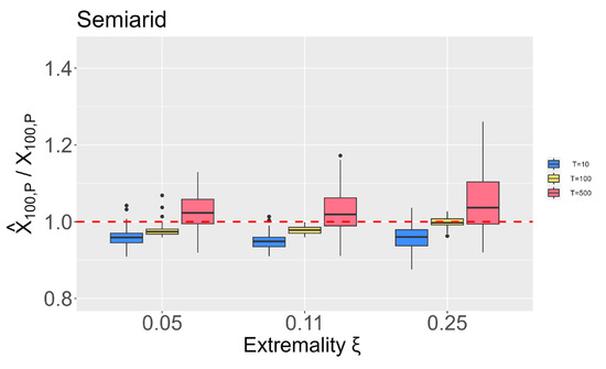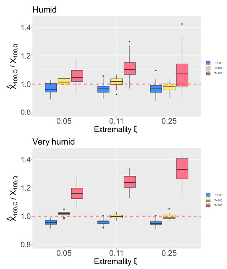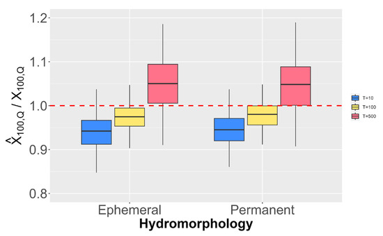 The aim of this analysis is to assess whether the extremality of the population has an impact on the flood quantile estimations. This extremality, understood as the number of registered extreme precipitation events per year, has been synthetically introduced in the populations by means of modifying the shape parameter ξ of the E-GPD, obtaining three climate extremality: low extremality (); medium extremality (); and high extremality (). Figure 7 shows the boxplots of the quantile estimates for an ephemeral river for return periods of 10, 100, and 500 years in the three analyzed climates before, and the three climate extremalities. Results show that are generally well estimated independently of the climate extremality, albeit RRMSE and CV values slightly increase as the climate is more extreme. Still, RRMSE values range from 1.42% to 4.17%, which indicates a very good estimation. are underestimated for all three climate extremalities, presenting RRMSE values quite similar for all climates and climate extremality, except for the semi-arid climate, where the value increases considerably. In the case of , and with the only exception of the semi-arid climate with low extremality where the RRMSE value is satisfactory (i.e., 4.66%), quantile estimates systematically overestimate the population quantiles. This is more evident as the population is more extreme, and especially as the climate becomes more humid, reaching RRMSE values of up to 37.43% and CV values of up to 10.50%.
