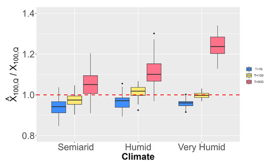Boxplots of flood quantile estimates for an ephemeral river with medium climate extremality () for return periods of 10, 100, and 500 years in the three analyzed climates.