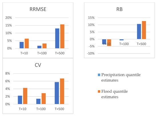 RRMSE, CV, and RB values for the estimated precipitation and flood quantiles for return periods of 10, 100, and 500 years, the three climate extremality ( = 0.05, 0.11, and 0.25), and the three analyzed climates.