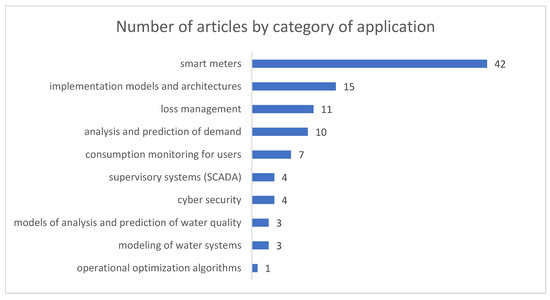 The abstracts of the selected articles were analyzed independently by the authors to identify applications of smart water-management systems. The analyzed articles were entered in the lines of a Microsoft Excel spreadsheet and the applications in the columns; then, the applications mentioned in each article were highlighted. During the analysis stage, 36 articles were excluded because they either focused on other research areas (agriculture, energy, rainwater drainage, and sectorization of supply networks) or did not address applications related to smart water-management systems; therefore, 62 articles remained. A total of 100 application mentions were identified and grouped into 10 categories by similarity.