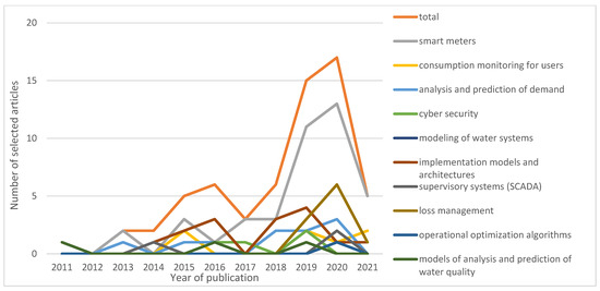 The interest of the authorities of Dhaka (Bangladesh) [53] and of Australia and New Zealand [9] in the implementation of smart meters and the good results obtained in reducing water consumption after they were implemented in Capetown (South Africa) [35] were evidence found about the interest in and benefits of such technology. This perception of benefit was corroborated by the volume of scientific production on the subject: 42 articles on smart meter applications. From this set of articles, 15 contextualized smart meters with other applications and, among these, 10 stood out for mentioning smart meter applications and loss management simultaneously (see comments in Table 1).