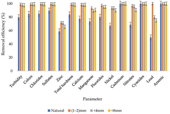 The concentrations within the collected samples were subjected to a comprehensive comparison against internationally recognized water quality standards established by the World Health Organization (WHO) for potable water. As demonstrated in Table 4, the outcomes clearly reveal that a significant number of water quality parameters within the untreated wastewater did not meet the established benchmarks for safe drinking water. This disparity highlights the need for effective treatment strategies to align the water quality with the stipulated standards. However, upon closer examination, it becomes evident that the introduction of natural zeolite treatment without biofilm did lead to noteworthy improvements in some parameters. Despite the commendable removal efficiency achieved in this case, certain parameters, including turbidity, color, calcium, and nickel, still remained non-compliant with the established standards. These results underscore the importance of holistic treatment approaches that not only focus on achieving high removal efficiencies, but also prioritize achieving water quality that adheres to regulatory guidelines. Interestingly, a pivotal shift is observed when the samples underwent treatment involving different particle sizes in combination with biofilm. Specifically, when subjected to the (1–2) mm, <4 mm, and <8 mm particle size systems with biofilm, the treated effluent demonstrated compliance with all established water quality standards across various parameters. This transformation in the treatment outcomes suggests the potential of integrating biofilm and appropriate particle sizes to achieve a harmonious balance between effective contaminant removal and the attainment of safe and compliant water quality. In essence, the results underscore the complexity of achieving water quality standards through wastewater treatment. While the natural zeolite treatment without biofilm achieved removal efficiency improvements, it was not always sufficient to meet the stringent standards. However, the combination of biofilm and optimized particle sizes displayed the ability to consistently bring treated effluent in line with regulatory requirements. These findings not only highlight the significance of efficient removal processes, but also emphasize the necessity of comprehensive treatment strategies that prioritize the attainment of safe and compliant drinking water. This provides valuable insights for future wastewater treatment endeavors, underscoring the importance of holistic approaches in achieving water quality goals.