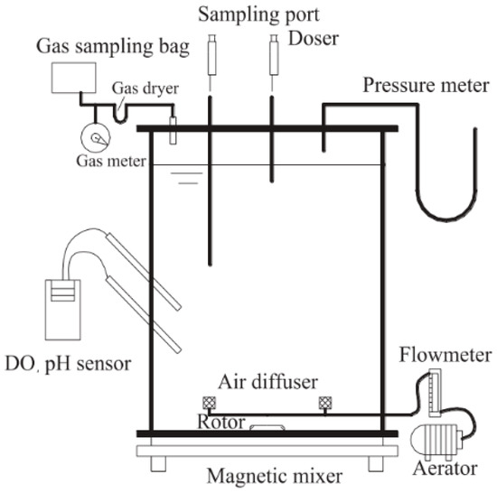 The NH4+-N, NO2−-N, and NO3−-N were measured according to methods described in previous studies [17]. The DO, pH, and T were measured using an oxygen, pH, and temperature meter (WTW 340i, WTW Company, Munich, Germany), and the temperature and DO were controlled using an appropriate sensor and PLC, respectively. The Mixed Liquid Suspended Solids concentration was measured at the beginning and end of each test to obtain an average value, which was used for the calculation of the NH4+-N oxidation rate, NOx−-N production rate, and N2O emission rate. The total N2O production comprised the N2O emitted in the gaseous phase (emission gas N2O) and the N2O dissolved in the mixed liquid phase (dissolved N2O). The N2O concentrations in the gas samples were analyzed in triplicate using a gas chromatograph (Agilent 6890N, Santa Clara, CA, USA). The overhead space method was used to analyze the dissolved N2O. Water and N2O samples were taken at 30 min intervals.