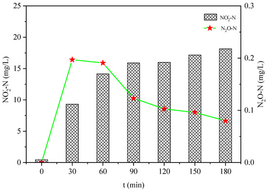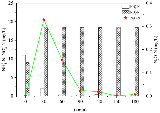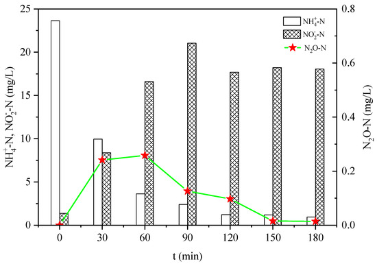 Figure 2 shows the changes in the nitrogen levels (initial NH4+-N = 20 mg/L) at salinity: 0 mg/L NaCl. The oxidation of NH4+ caused N2O to reach its maximum value (0.26 mg/L) at 60 min. Next, with the gradual completion of NH4+ oxidation, even though there was still a high amount of NO2−-N produced in the system, the output of N2O gradually decreased and tended to 0. This indicated that, during the oxidation of NH4+, the NH4+ oxidation process was the source of the electrons produced by the N2O. When the oxidation of NH4+ ended, NO2− could not be denitrified due to the high concentration of no electron donor in the system. During the reaction time of 180 min, the total yield of N2O was 0.75 mg/L.