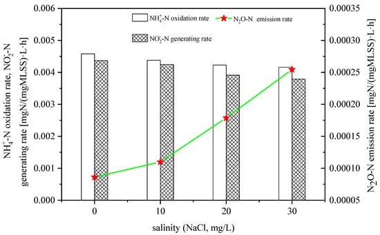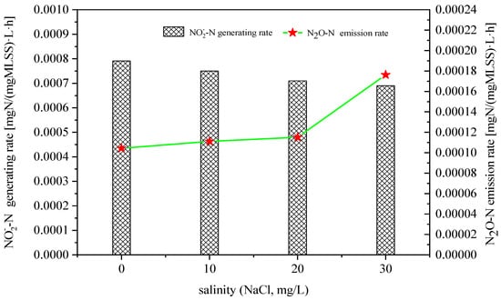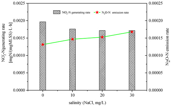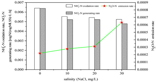 Figure 7 shows the variation trend in N2O in autotrophic denitrification under the influence of salinity. There was a decrease in the oxidation rate of NH4+-N with an increase in salinity, and the formation rate of NO2−-N also decreased with an increase in salinity. There was a successive increase in the emission rate of N2O-N with an increase in the salinity load. At salinity = 0 mg/L, 10 mg/L, 20 mg/L, and 30 mg/L, the values were 0.22 mgN/(gMLSS·L·h), 0.28 mgN/(gMLSS·L·h), 0.31 mgN/(gMLSS·L·h), and 0.63 mgN/(gMLSS·L·h). At salinity (0 mg/L to 20 mg/L), the rate of N2O emissions increased relatively slowly. At salinity = 30 mg/L, the formation rate of N2O-N rapidly increased to 0.63 mgN/(gMLSS·L·h). This indicated that an increase in salinity resulted in an increase in N2O emissions during partial nitrification.
