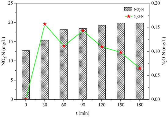 Figure 8 shows the variation trend in N2O during autotrophic denitrification (10 mg/LNH2OH-N and 10 mg/L NaNO2-N) under the influence of salinity. There was a rapid increase in N2O-N to 0.16 mg/L at 30 min. The NaNO2 levels increased during the whole reaction process, which indicated that NH2OH was continuously oxidized by microorganisms. As the reaction progressed, there was an insignificant increase in NO2−-N, and the N2O emissions were stabilized and gradually declined, which indicated that the presence of NH2OH was critical for the N2O emissions. During the whole reaction process, the total N2O emissions were 0.68 mg/L.