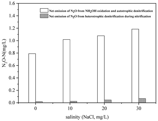 In the nitrification process of wastewater biological treatment, N2O is produced mainly during the oxidation of NH3 by Ammonia-Oxidizing Bacteria (AOB) to NO2− [5,6]. In this process, there are three possible production paths: (1) N2O is the byproduct of the incomplete oxidation of hydroxylamine in the oxidation process [7,8,9,10]; (2) N2O is the product of the autotrophic denitrification of AOB using NO2− as an electron acceptor [8,11]; and (3) the chemical reaction of NH2OH with NO2− or O2 can also produce partial N2O [12,13]. Additionally, similar to the denitrification process, N2O might also be produced during nitrification due to the denitrification of heterotrophic bacteria [14]. However, there have been no studies documenting the influence of salinity on the N2O produced by heterotrophic denitrification during nitrification.