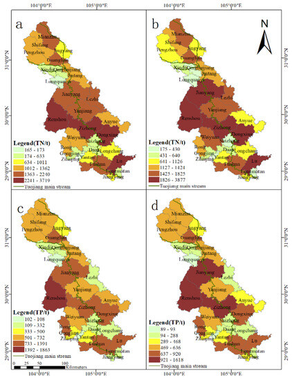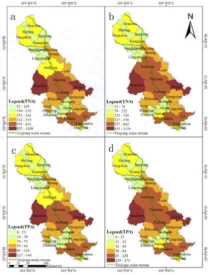 Spatial distribution of nitrogen and phosphorus loads in poultry and livestock farming source of the TJRB, (a,c): 2019; (b,d): 2018.