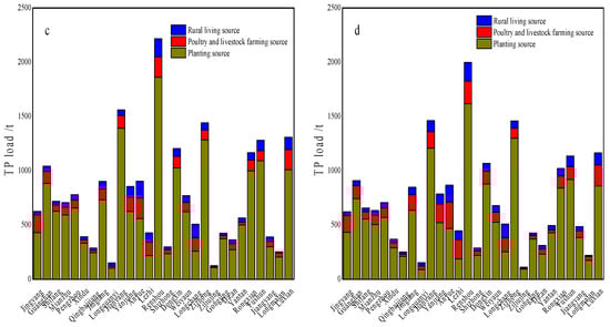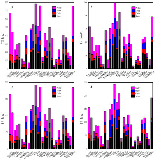 Composition of TN and TP loads of the poultry and livestock farming source in the TJRB, (a,c): 2019; (b,d): 2018.