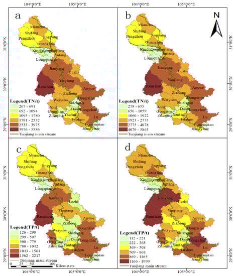 In 2019, a total of 92.9% of districts and counties in the TJRB showed varying degrees of reduction in TN load, among which Shizhong District, Weiyuan County, Longchang City, and Jiangyang District had the largest reduction, reaching 12.77%, 15.18%, 15.70%, and 15.74%, respectively. In terms of TP load, only 10.7% of districts and counties saw a slight decrease in 2019, but Jiangyang District saw a larger decrease in TP load in 2019, reaching 27.9%. Among the 28 districts and counties, the TN and TP load of Jianyang City, Renshou County, and Zizhong County is much greater than that of other districts and counties. Neijiang, Chengdu, Deyang, Meishan, and Zigong have the highest TN and TP load in the basin. As shown in Figure S1, the contribution rate of each city to TN and TP load did not change significantly (p > 0.05) during the study period.