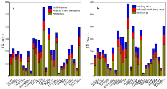Figure 7 reveals the composition characteristics of TN and TP loads in the TJRB. As observed, the planting source contributes the most to TN load in the TJRB, followed by rural living sources, while poultry and livestock farming sources make the smallest contribution. The TP load distribution follows the order of planting source > poultry and livestock farming source > rural living source. The planting source emerges as the primary contributor to both TN and TP loads from ANPS in the TJRB, with an average contribution of 61.43% and 77.39%, respectively. Conversely, rural living sources account for only 20.23% of TN loads and 9.15% of TP loads on average, while poultry and livestock farming sources contribute 18.34% of TN loads and 13.46% of TP loads on average.