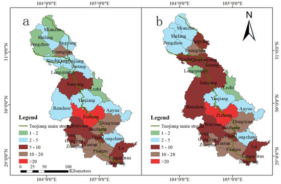 The GWF values for TN and TP of rural living sources in the TJRB are shown in Table S5. Since the GWF for TN was greater than that for TP, the GWF for TN was used to assess nitrogen and phosphorus pollution from rural living sources. In 2018, the GWF for rural living sources in the TJRB amounted to 11.713 billion m3. However, it decreased to 11.218 billion m3 in 2019, with 89.3% of districts and counties in the TJRB experiencing varying degrees of reduction in GWF in 2019. When examining the spatial distribution of GWF, it is notable that Anyue County, situated in the middle reaches of the TJRB, generally exhibited higher values. In contrast, Qingbaijiang District in the upstream and Ziliujing District in the downstream displayed relatively lower GWF values. Specifically, the GWF for Ziliujing and Longmatan Districts did not exceed 100 million m3 throughout the study period.