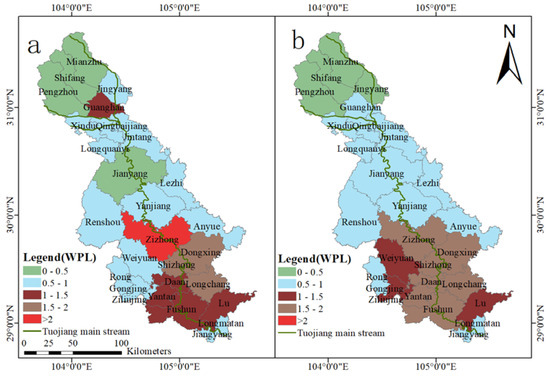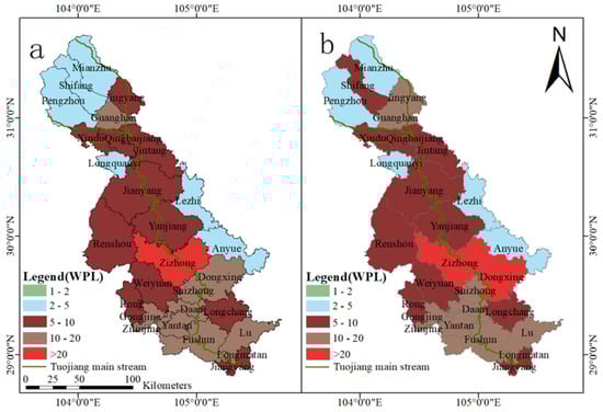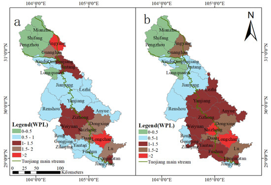 The spatial variation of WPL of the rural living source in the TJRB, (a): 2019; (b): 2018.