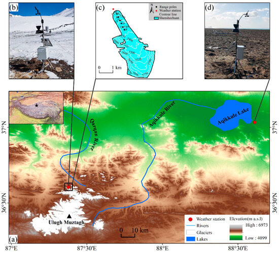 On 28 May 2022, the AQK meteorological station (37.033° N, 88.611° E) was deployed on the east bank of AQK (altitude 4243 m), and the SSG terminal meteorological station (36.605° N, 87.378° E) was deployed on the terminus of SSG (altitude 5070 m) two days later, on May 30. The meteorological elements monitored by the meteorological stations at AQK (Figure 1d) and at the terminus of SSG (Figure 1b) included temperature, solar radiation, relative humidity, precipitation, and wind speed and direction. From 30 May 2022 onwards, meteorological data were monitored at intervals of 10 min, 1 h, and 1 day.