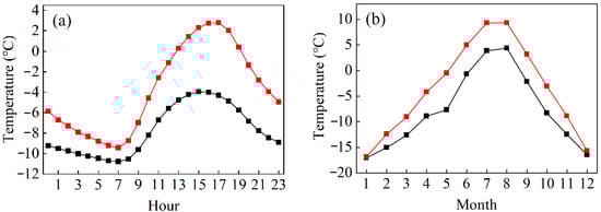 Daily (a) and monthly (b) changes in mean air temperature at AQK and the terminus of SSG; the red line shows the weather station at AQK, while the black line shows the weather station at the terminus of SSG.