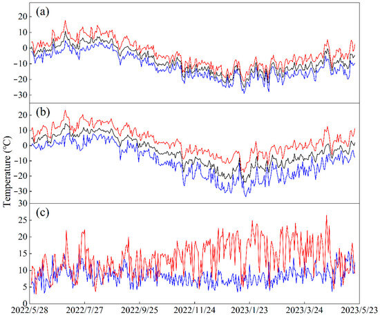Temperature changes at the terminus of SSG (a) and AQK (b) (red line represents the daily maximum temperature; black line represents the daily average temperature; blue line represents the daily minimum temperature), and their maximum daily temperature differences (c) (red and blue lines represent the maximum daily temperature differences at AQK and the terminus of SSG, respectively).