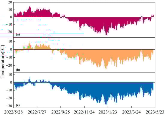 The temperature variation of AQK is essentially the same as that at the terminus of SSG, except that due to the altitude, the average daily temperature at the terminus of SSG is lower than that at AQK. In the whole year, the maximum daily average temperatures at AQK and the terminus of SSG occurred on 6 July, which were 14.6 °C and 10.9 °C, respectively, and the minimum daily average temperatures occurred on 17 January, which were −24 °C and −25 °C, respectively. The highest hourly temperatures at AQK and the terminus of SSG occurred at 16:00 and 15:00 on 6 July, when the temperatures were 23.49 °C and 17.81 °C, respectively, and the lowest hourly temperatures occurred at 08:00 on 19 January and 09:00 on 17 January, when the temperatures were −33.62 °C and −28.92 °C, respectively. At this time, AQK was colder than the terminus of SSG, although the terminus of SSG is at a higher elevation than AQK, and this phenomenon was concentrated from November to March (Figure 3a,b). The minimum and maximum diurnal temperature differences of AQK occurred on 2 June and 15 April, with differences of 2.9 °C and 26.5 °C, respectively. The minimum and maximum daily temperature differences of the terminus of SSG occurred on 2 June and 11 May, with differences of 3 °C and 15.8 °C, respectively (Figure 3c). In short, the diurnal temperature difference of the terminus of SSG has little fluctuation throughout the year, especially after entering the winter months. However, the diurnal temperature difference of AQK in the winter months is much higher than that in the summer months. During the summer months, the diurnal temperature difference in AQK is slightly greater than that at the terminus of SSG, but in the winter months, the diurnal temperature difference of the former is much greater than that of the latter.