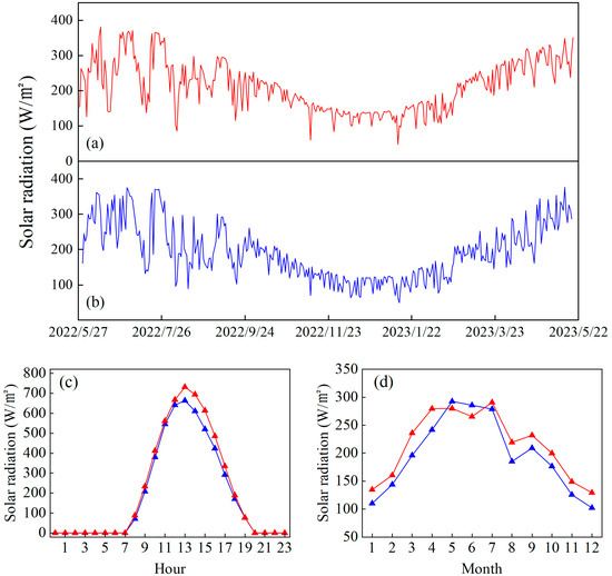 Changes in solar radiation at AQK (a) and the terminus of SSG (b); radiation changes at both sites on a daily scale (c) and on an annual scale (d), with the red and blue lines showing solar radiation changes at AQK and SSG, respectively.