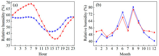 - The solar radiation of the two places is greater in the summer than in the winter, which is significantly affected by precipitation. The relative humidity is greater in the early morning than in the late afternoon, greater in the summer than in the winter, and shows a single-peak, single-valley type of change, which is mainly affected by temperature and precipitation.