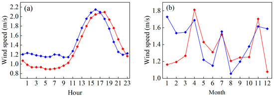 Wind speed variations at AQK and the terminus of SSG on the daily (a) and annual (b) scales; the red and blue lines are wind speed variations at AQK and the terminus of SSG, respectively.