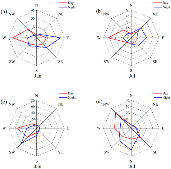 Changes in diurnal wind direction in January and July at AQK and the terminus of SSG: (a,b) are the wind frequencies of AQK in January and July, respectively; (c,d) are wind frequencies at the terminus of SSG in January and July, respectively.