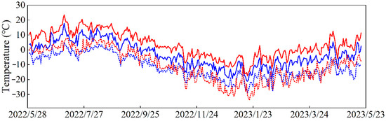 Maximum and minimum temperatures of the terminus of SSG and AQK. The red solid line and dotted line are the daily maximum and minimum temperature of AQK, respectively. The blue solid line and dotted line are the daily maximum temperature and daily minimum temperature at the terminus of SSG, respectively.