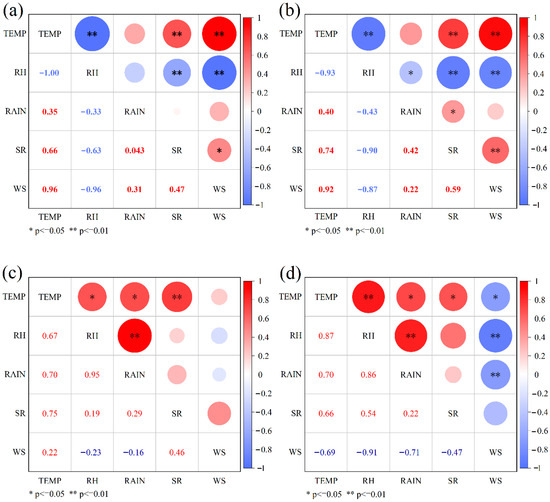 The relationship between meteorological elements at AQK and the terminus of SSG: (a,b) the correlation between meteorological elements at the diurnal scale at AQK and the terminus of SSG, respectively. (c,d) The correlation between meteorological elements at the annual scale at AQK and the terminus of SSG, respectively.