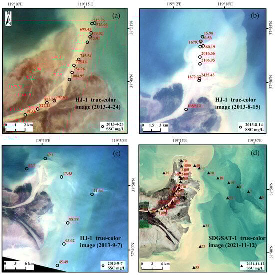 Distribution of SSC sample data. In figures (a) to (c), black “〇” symbols represent the locations of field-measured SSC data in 2013, with data collected on 25 April (a), 14 August (b), and 7 September (c). The background images in figures (a) to (c) correspond to near-temporal HJ-1 satellite true-color images acquired on 24 April (a), 15 August (b), and 7 September (c), matching the field SSC data collection times. In figure (d), black “▲” symbols represent artificially generated SSC data locations, with the background image corresponding to a true-color image from SDGSAT-1 on 12 November 2021. The red numbers adjacent to the black “〇” and “▲” symbols indicate the SSC values at those locations, measured in mg/L.