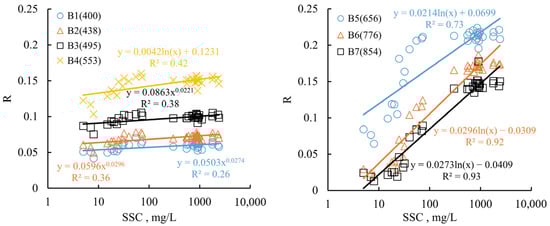 The correlation between the reflectance of different spectral bands in the SDGSAT-1 multispectral imagery and SSC. The vertical axis (R) represents reflectance.
