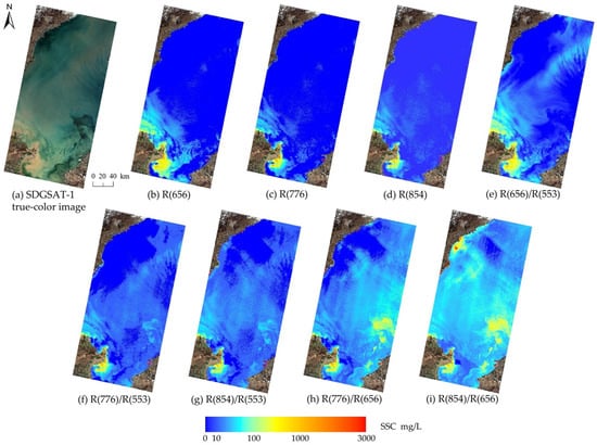 SSC inversion results are based on different models. (a) SDGSAT-1 true-color image on 12 November 2021. (b–i) present the SSC inversion results using different models. The inversion models include (b) R(656), (c) R(776), (d) R(854), (e) R(656)/R(553), (f) R(776)/R(553), (g) R(854)/R(553), (h) R(776)/R(656), and (i) R(854)/R(656).