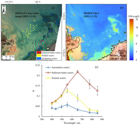Distribution and corresponding statistical values of sediment-laden water samples and anomalous water samples. (a) presents the geographical distribution of the samples. (b) presents the distribution of chlorophyll-a concentrations. The terrestrial boundary in (b) is denoted by the black curve. The base images for both (a) and (b) are dated 12 November 2021, with the satellite sensors being SDGSAT-1 MI and MODIS, respectively. (c) presents the spectral curves of the samples.