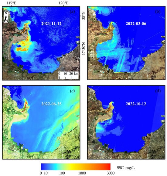 SSC inversion results at different time periods. The base map image and SSC inversion results shown in (a) are from 12 November 2021. Similarly, the dates for (b–d) are 6 March 2022; 25 June 2022; and 12 October 2022, respectively.