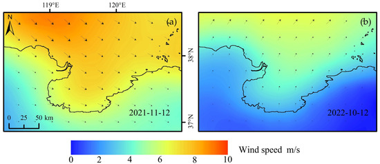 Surface wind fields during the passage of the SDGSAT-1 satellite. The time difference between satellite passage and wind field data is within 3 min. The wind field data shown in (a,b) correspond to the dates of 12 November 2021 and 12 October 2022, respectively. In the wind field diagram, the arrows indicate the direction of the wind.