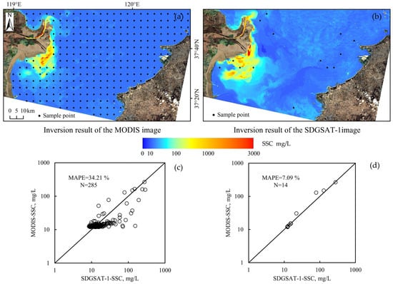 The SSC inversions derived from MODIS and SDGSAT-1 imagery at the sampling point locations are presented in Figure 9c, and the SSC values based on SDGSAT-1 data exhibit a consistency with those from MODIS, yielding an R2 of 0.71 and an MAPE of 34.21%. Sampling points with better correspondence based on the true-color imaging and sediment distribution patterns were selected (as shown in Figure 9b), and a higher consistency in the SSC values was observed between MODIS and SDGSAT-1, with an R2 of 0.96 and an MAPE of 7.09%.