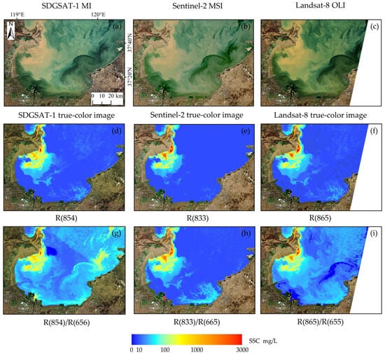 SSC inversion results are based on different satellites and models. True-color images captured by SDGSAT-1, Sentinel-2, and Landsat-8 are represented by (a–c), respectively, with all images taken on 12 November 2021. (d–i) present the inversion results of SSC. (d,g) present the SSC inversion results based on the SDGSAT-1 multispectral image using the R(854) and R(854)/R(656) models, respectively. (e,h) present the SSC inversion results based on the Sentinel-2 image using the R(833) and R(833)/R(665) models, respectively. (f,i) present the SSC inversion results based on the Landsat-8 image using the R(865) and R(865)/R(655) models, respectively.