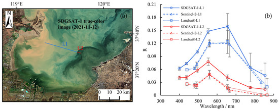 The profile positions and corresponding spectral curves. (a) presents the geographical positions of the profiles, with the blue line representing profile L1 (sediment-laden waters), the red line representing profile L2 (anomalous waters), and the base map utilizing the SDGSAT-1 image from 12 November 2021. (b) presents the spectral curves at the respective positions of the profiles, with T-shaped error bars indicating standard deviation.